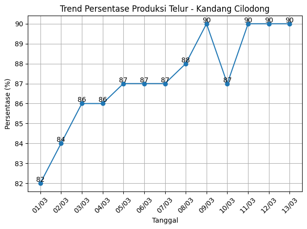 Produksi telur di Peternakan KOSTRAD 328 Cilodong menunjukkan peningkatan signifikan pada awal April 2026. Berdasarkan data operasional, persentase produksi naik dari 82 persen pada 1 April 2026 menjadi 90 persen, dan kini berada dalam kondisi stabil.